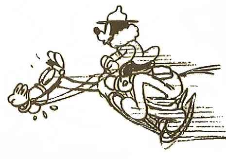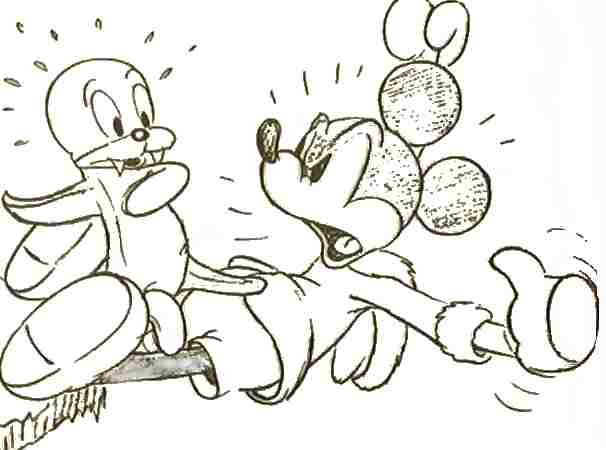 (1936) Black Pete kidnaps Minnie Mouse and tries to force her in show where a goldmine is. Mickey Mouse intervenes. Barks wrote the story and drew close to 400 storyboard sketches as well as model sheets for Mickey and his horse Tanglefoot. |