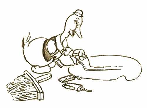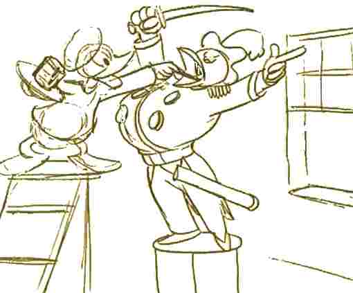 DECORATORS (1937) Donald Duck and his helper Gus Goose renovate a mansion. Barks wrote the story and made storyboard sketches. He even made a second storyboard featuring a Gyro Gearloos-like character instead of Gus. |