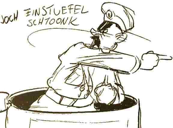 (1942) Donald Duck accidentially drives a tank into German lines in order to get away from sergeant Black Pete. Barks did a memorable parody of Hitler in this cartoon. |